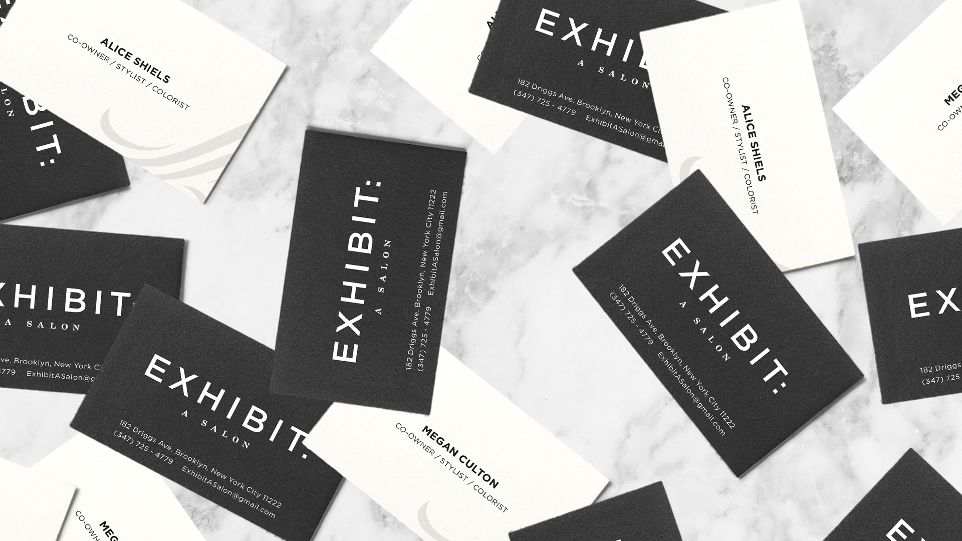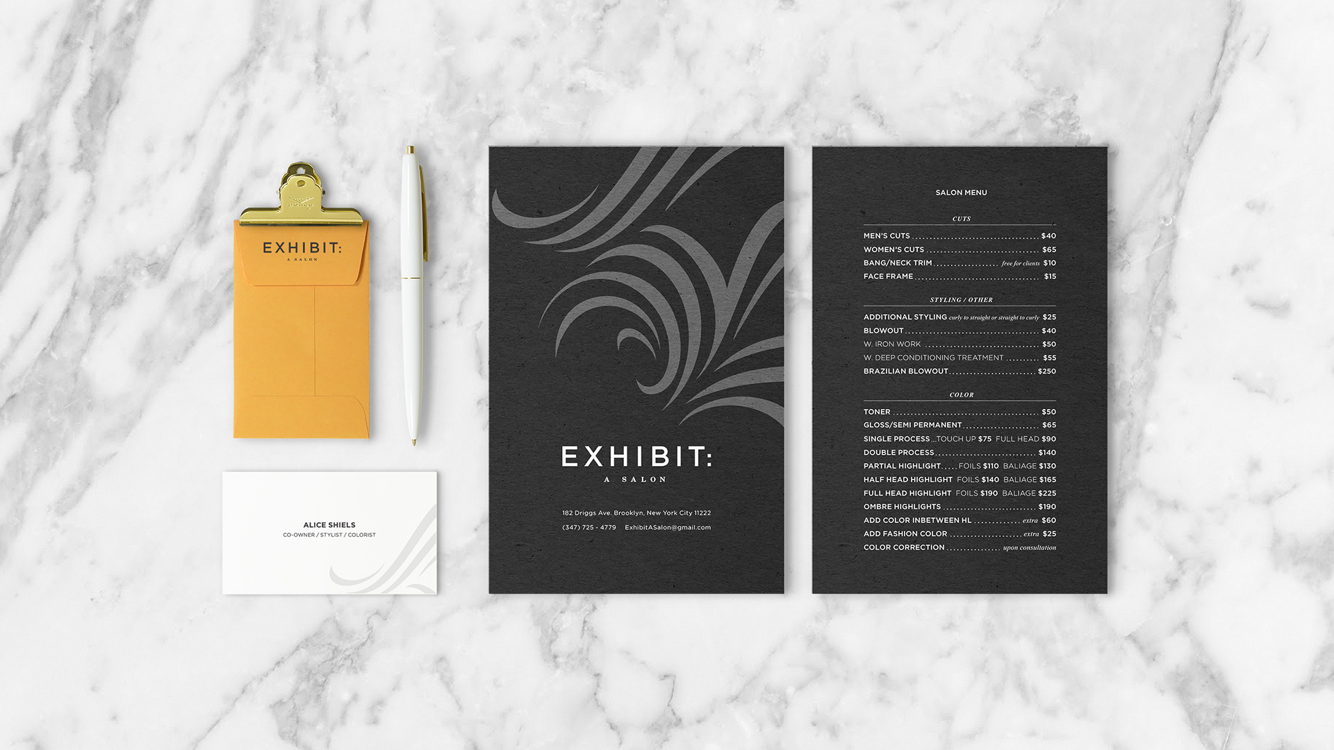 Exhibit: A Salon is a unique hair salon nestled in Greenpoint, Brooklyn with a second life as a gallery showcasing works from local artists. They asked me to help refine their logo and design brand collateral reflective of the artistry they represent.