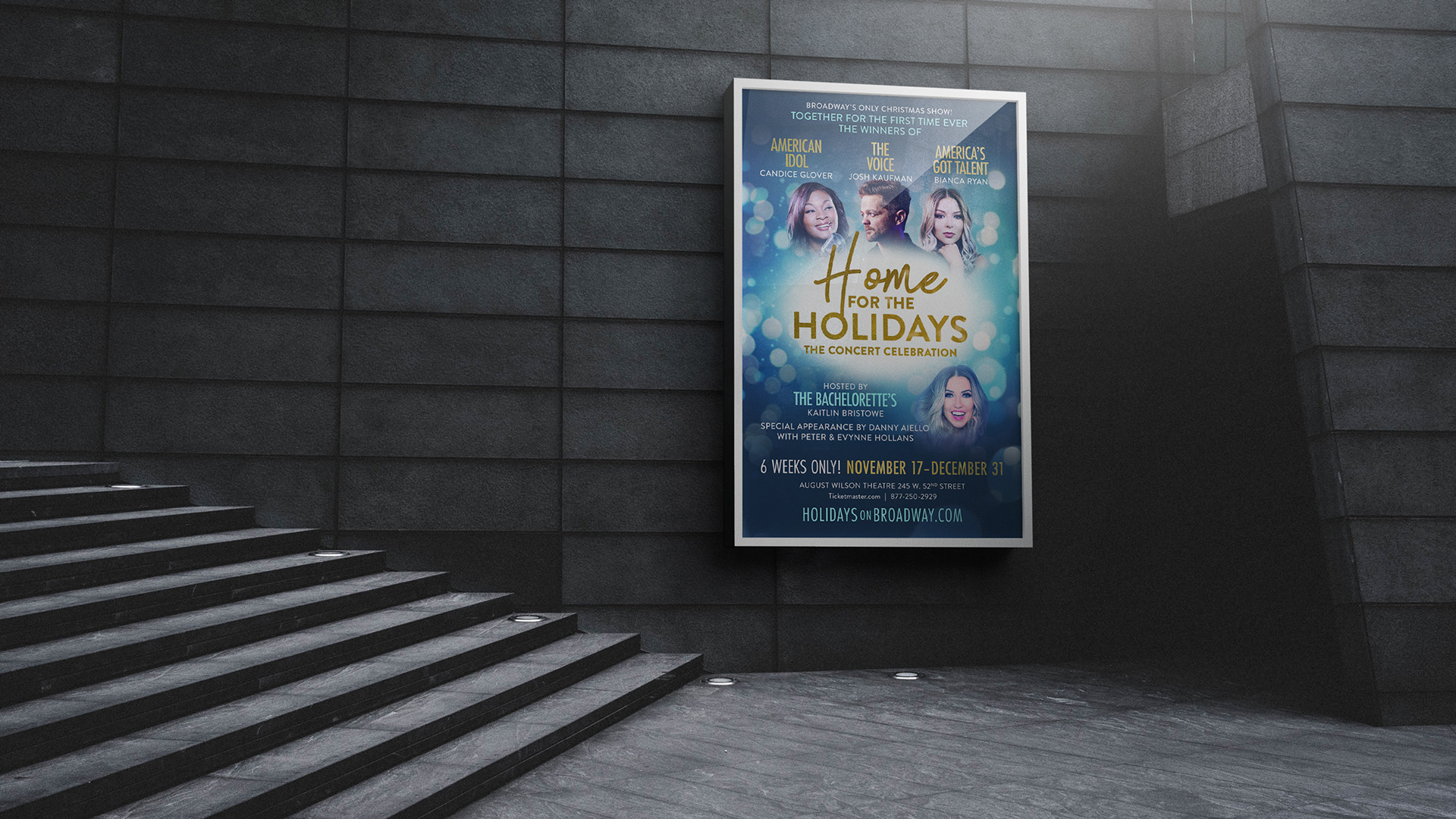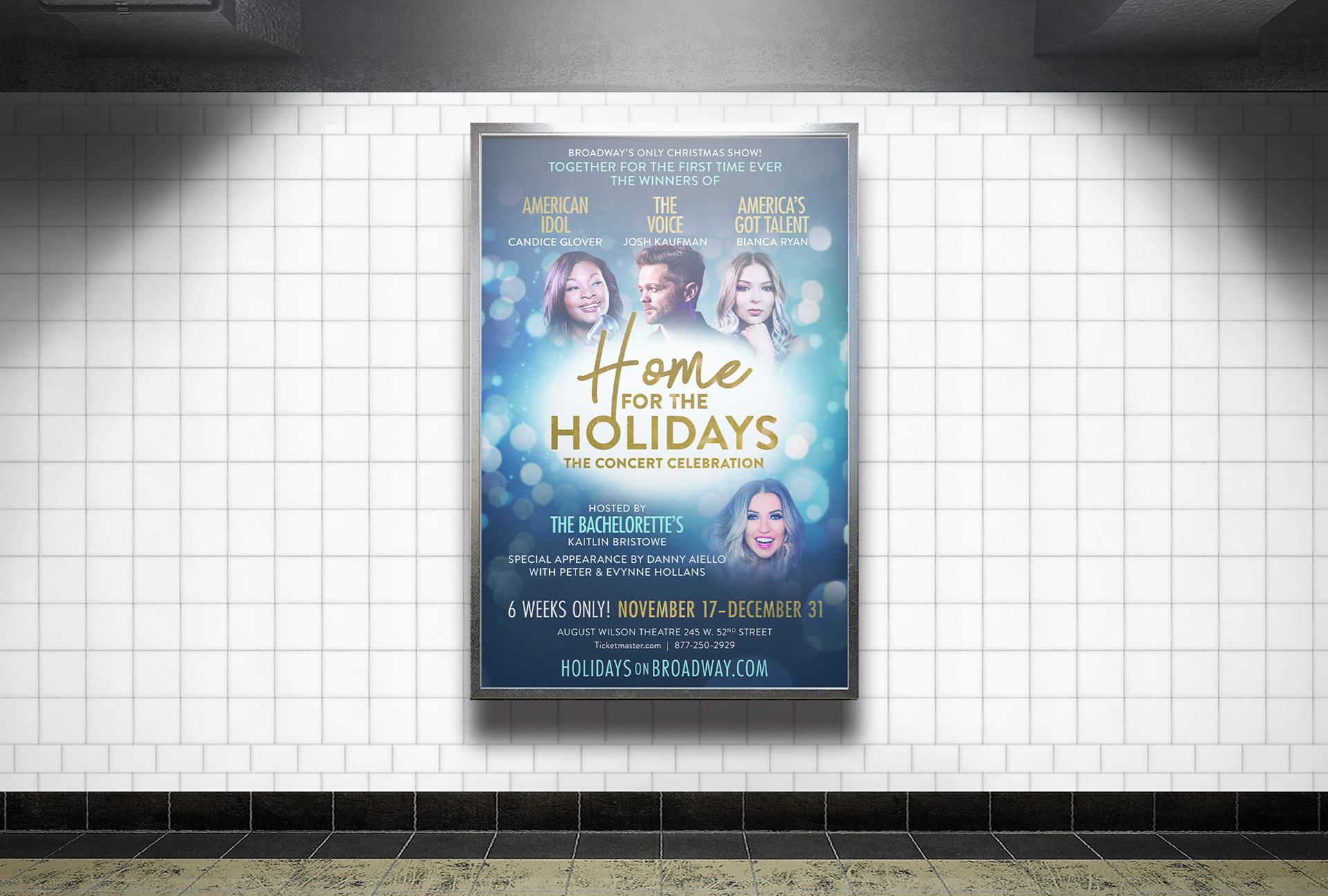 Home For The Holidays is a Christmas-themed Broadway production starring winners of American Idol, The Voice and America’s Got Talent running for a limited engagement at the August Wilson Theatre. They asked me to create keyart and design the poster artwork used for ads and media promos.