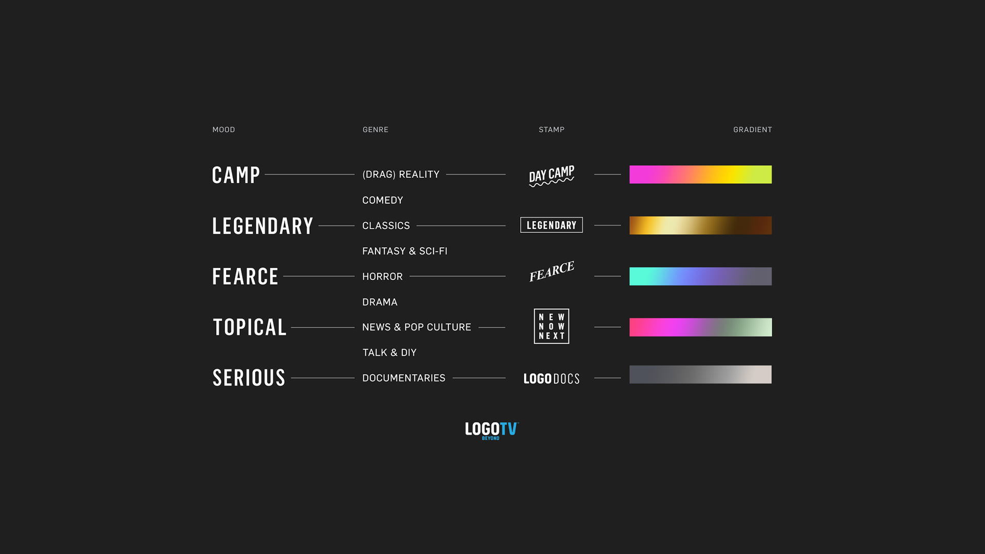 After 10 years on-air, Logo TV was ready for a brand refresh and wanted to lean in on the spirit they launched with in a contemporary way. Shortening their original tagline, “Beyond Labels,” I helped to define what “Beyond” meant in the design of their new Brand Bible. In re-evaluating how their content was structured, I helped to streamline their branding across on-air, print, digital and social media.